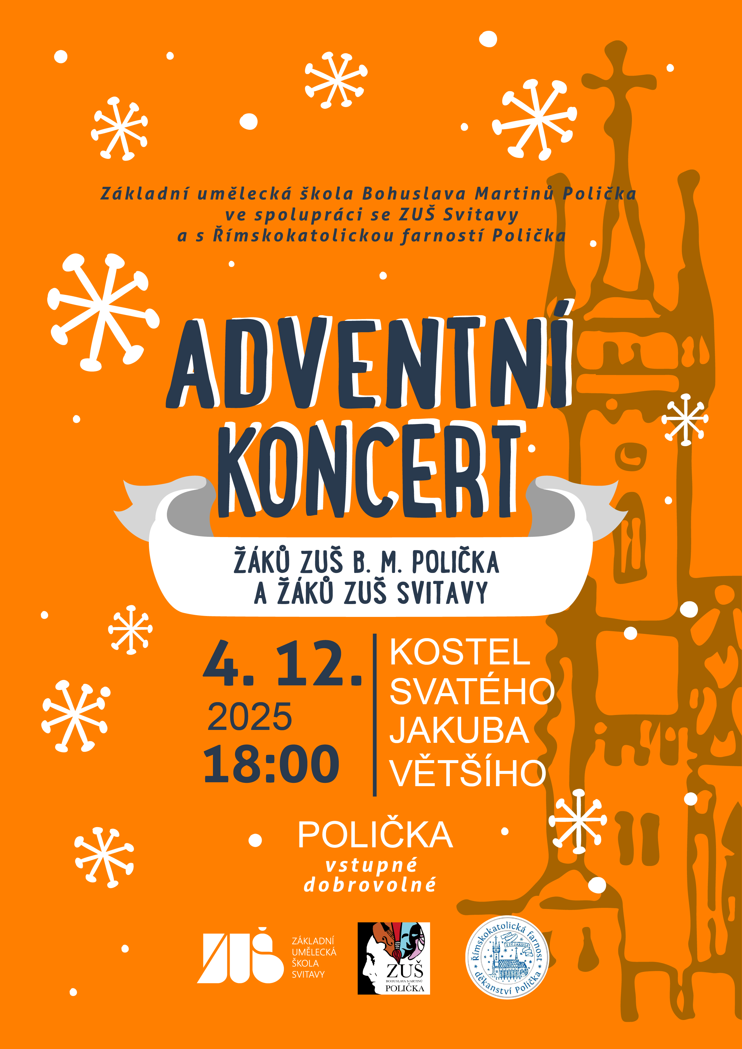 4. 12. 2025 se od 18 hodin již potřetí sejdeme společně s varhaníky ze ZUŠ Svitavy v kostele sv. Jakuba Většího na Adventním koncertě, který se tak pomalu stává další tradiční akcí v našem kalendáři. Těšit se můžete např. na pěvecký sbor, nejrůznější dechová seskupení od fléten, přes klarinety až k žesťům a samozřejmě nemohou chybět již zmiňované varhany, na které se představí naši hosté ze ZUŠ Svitavy.