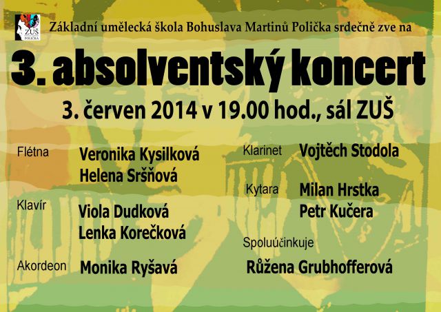 V úterý 3. června se koná od 19 hodin v sále školy 3. absolventský koncert. Program bude velmi pestrý. Na flétnu se představí Veronika Kysilková a Helena Sršňová, na klarinet Vojtěch Stodola. Na klavír zahraje Viola Dudková a Lenka Korečková, na akordeon Veronika Ryšavá. Dále si poslechnete kytaristy Milana Hrstku a Petra Kučeru. Srdečně zveme.