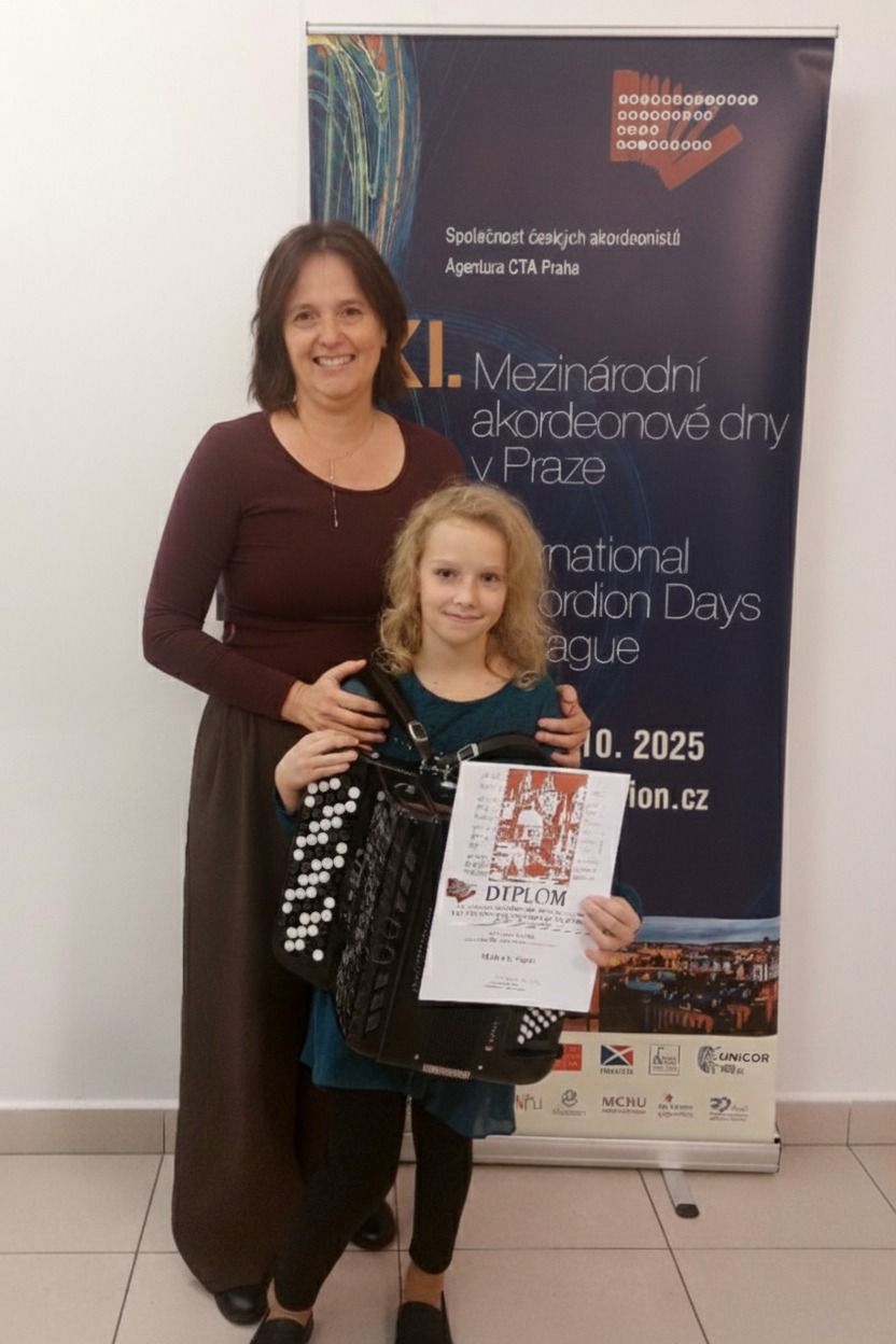 Gratulujeme Míše Veselé, která se stejně jako vloni společně se svou učitelkou Jitkou Nackovou vypravila na Mezinárodní akordeonové dny v Praze. Míša se očividně soupeřů z různých zemí světa nezalekla a opřela se do toho ve velkém stylu, díky čemuž se ve své kategorii umístila ve